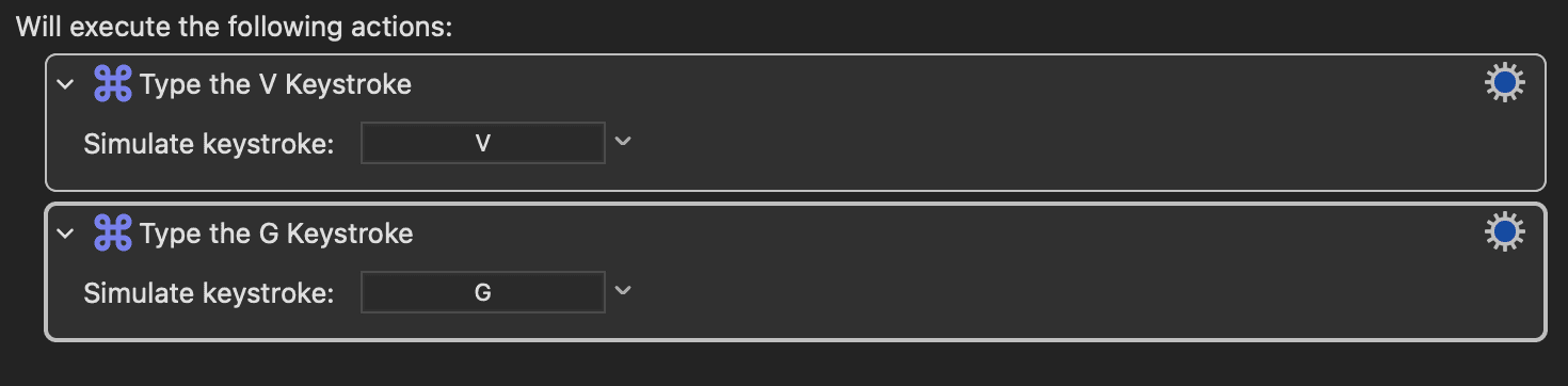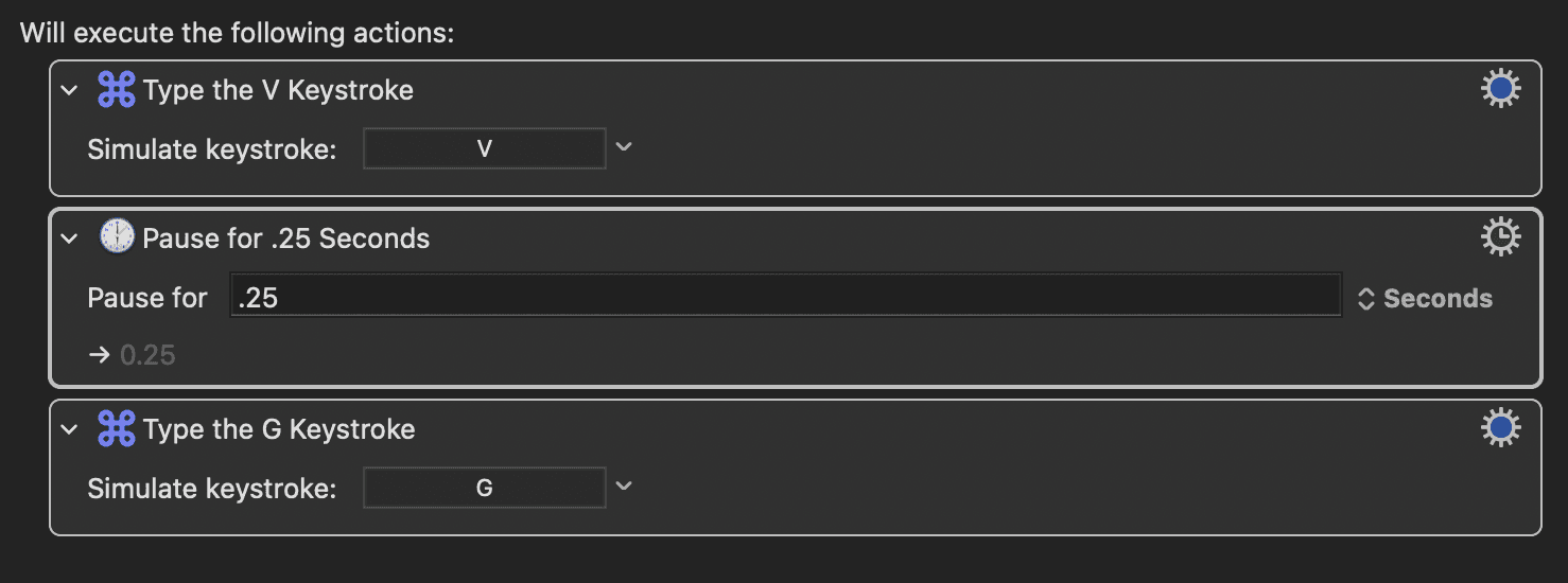 We actually need to simulate V, wait a moment, and then press G. Good news, this can be done in Keyboard Maestro using an action called Pause.