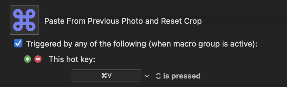 Next, we want to assign actions to the macro. There are two types of actions that could be used in the scenario. The first is to simulate keystrokes, the other would be to trigger menu items. I'm going to stick with the first option for now. I will simulate V (paste from previous) and then simulate G (reset crop).