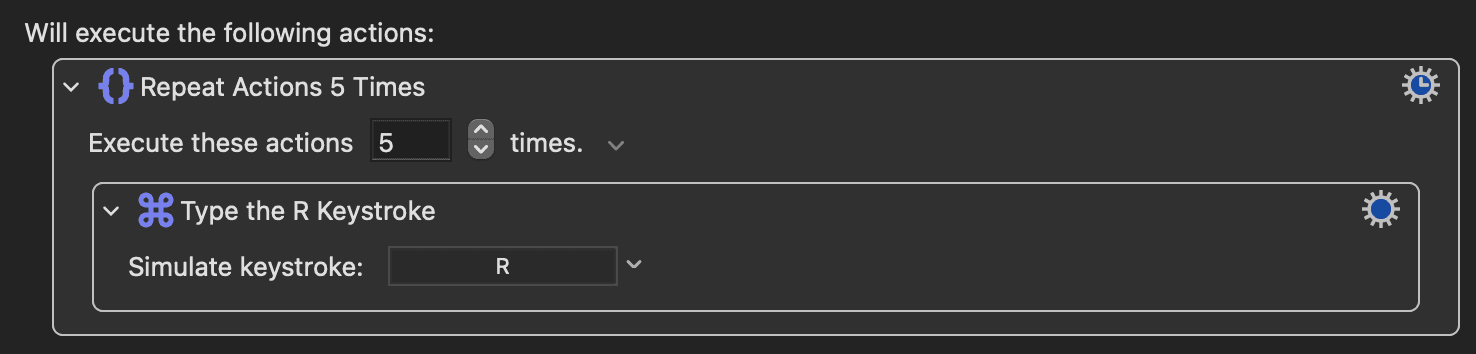 When the key 4 is pressed it simulates me pressing R five times. This can be done by adding a simulate keystroke action inside of a repeat action.