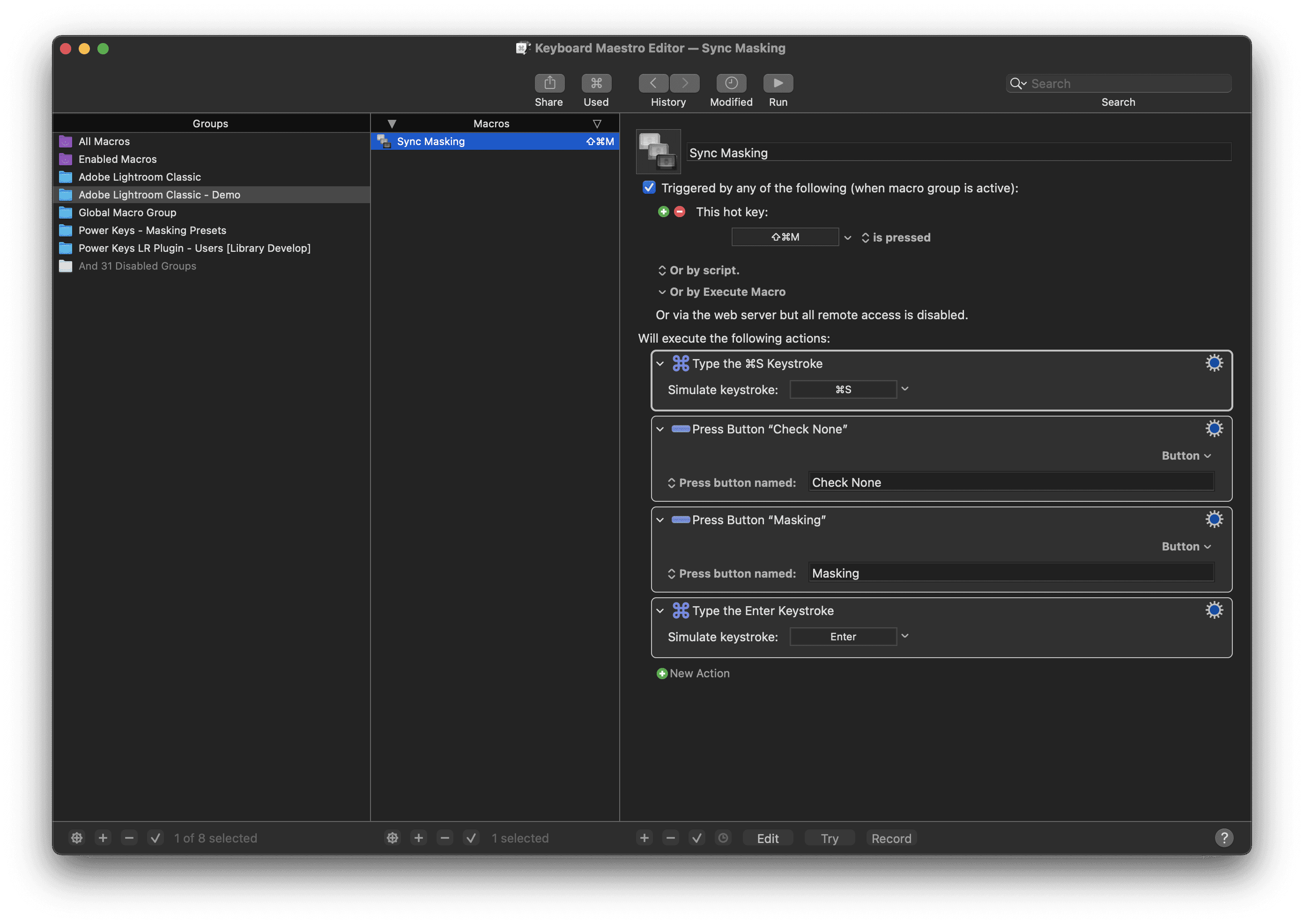 In the macro below, I am syncing just the masking settings with the keyboard shortcut Command + Shift + M. One keyboard shortcut to do all the clicking and keyboard presses.