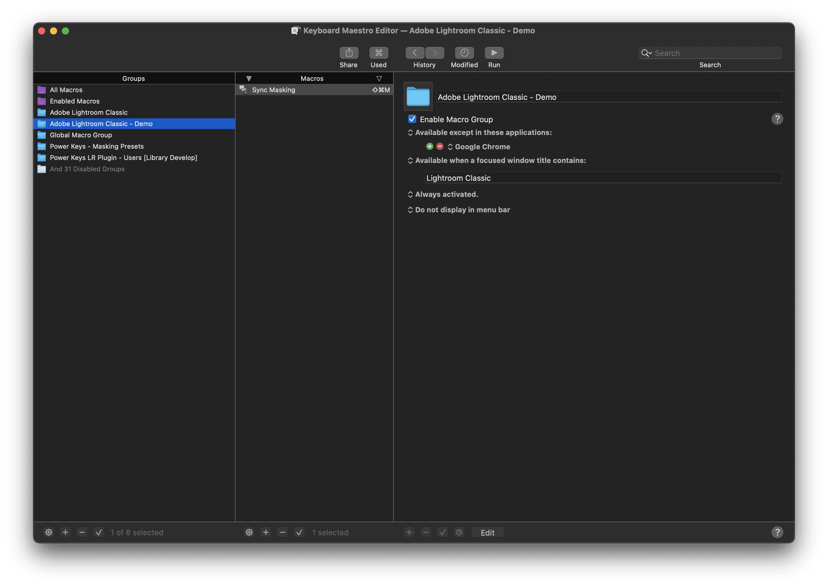 First, you'll want to install Keyboard Maestro. Next, let's set up a macro group so your new macros are only triggered in Lightroom Classic.